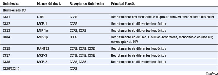 Diferentes combinações de mais de 17 receptores de quimiocinas distintos são expressas em diferentes tipos de leucócitos, resultando em padrões distintos de migração dos leucócitos. Existem 10 receptores distintos para as quimiocinas CC (denominados CCR1 a CCR10), seis receptores para as quimiocinas CXC (denominados CXCR1 a CXCR6) e um receptor para CX3CL1 (denominado CX3CR1) (Tabela 3-2). Os receptores de quimiocinas são expressos em todos os leucócitos, dentre os quais, as células T exibem o maior número e a maior diversidade. Os receptores apresentam uma sobreposição de especificidade para as quimiocinas dentro de cada família, e o padrão de expressão celular dos receptores determina que tipos de células irão responder a quimiocinas específicas. Certos receptores de quimiocinas, notavelmente o CCR5 e o CXCR4, atuam como co-receptores para o vírus da imunodeficiência humana (HIV) (Cap. 20). Alguns linfócitos T ativados secretam quimiocinas que se ligam ao CCR5 e que bloqueiam a infecção pelo HIV através de sua competição com o vírus.