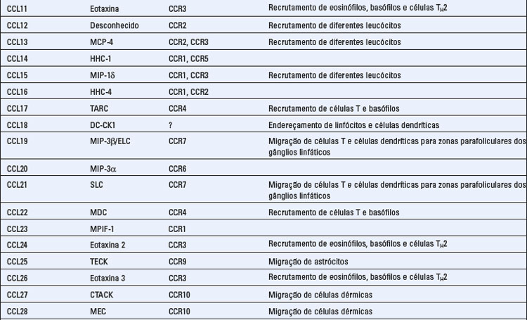 • As quimiocinas estão envolvidas no desenvolvimento dos órgãos linfoides, e regulam o trânsito dos linfócitos e de outros leucócitos através dos tecidos linfoides periféricos. A função das quimiocinas na organização anatômica dos tecidos linfoides foi discutida no Capítulo 2.