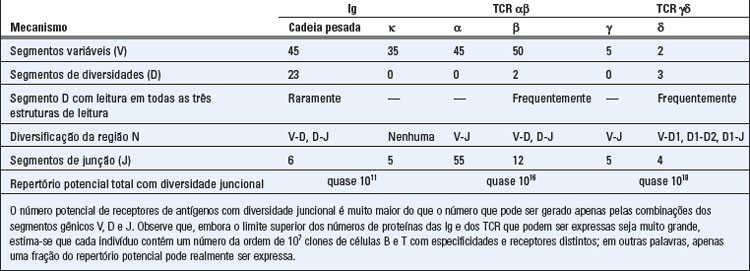 • A diversidade dos repertórios de anticorpos e de TCR é gerada pelas associações combinatórias de múltiplos genes V, D e J da linhagem germinativa, enquanto a diversidade juncional é gerada pela adição ou remoção aleatórias de nucleotídios nos locais de recombinação. Esses mecanismos geram a maior diversidade nas junções dos segmentos que formam a terceira região hipervariável dos polipeptídios de anticorpos e de TCR.