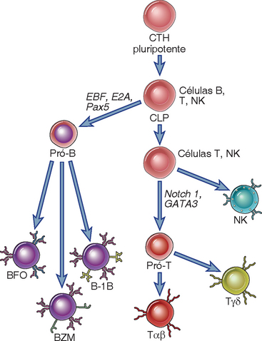 As células-tronco pluripotentes na medula óssea (e no fígado fetal), denominadas células-tronco hematopoiéticas (CTH), dão origem a todas as linhagens de células sanguíneas, incluindo os linfócitos. As CTH amadurecem e transformam-se em progenitores linfoides comuns, que podem dar origem às células B, células T, células NK e algumas células dendríticas (Fig. 8-2). A maturação das células B de progenitores que se comprometem com essa linhagem ocorre, em sua maior parte, na medula óssea, e antes do nascimento, ocorre no fígado fetal. As células-tronco derivadas do fígado fetal dão origem principalmente a um tipo de célula B, denominada célula B-1 (mais bem definida em roedores), enquanto as CTH derivadas da medula óssea dão origem à maior parte das células B circulantes (células B foliculares). Os precursores linfócitos T deixam o fígado fetal antes do nascimento e a medula óssea durante a vida, circulando até o timo, onde completam o seu processo de maturação. A maioria das células T, que consistem em células T αβ, desenvolve-se de CTH derivadas da medula óssea, enquanto a maior parte das células T γδ origina-se de CTH do fígado fetal. Em geral, as células B e T geradas no início da vida fetal possuem um repertório de receptores de antígeno menos diverso. Apesar de suas localizações anatômicas diferentes, os eventos iniciais de maturação de ambos os linfócitos B e T são fundamentalmente semelhantes.