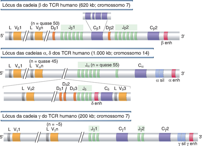 Os genes que codificam as cadeias α, β e γ dos TCR estão mapeados em três loci distintos em três cromossomos diferentes, enquanto o lócus da cadeia δ dos TCR encontra-se dentro do lócus α do TCR (Fig. 8-7). Cada lócus de TCR na linhagem germinativa inclui segmentos gênicos V e J, estando este último exatamente proximal aos éxons da região C em cada lócus. Além disso, os loci TCR β e TCR δ também possuem segmentos D, como o lócus das cadeias pesadas de Ig. Na extremidade 5′ de cada um dos loci dos TCR, existe um grupamento de vários segmentos gênicos V, dispostos de forma muito semelhante aos segmentos gênicos V das Ig. Numa posição proximal a cada gene V de TCR, há um éxon que codifica um peptídio líder, e, adjacente a cada éxon líder, existe um promotor para cada gene V.
