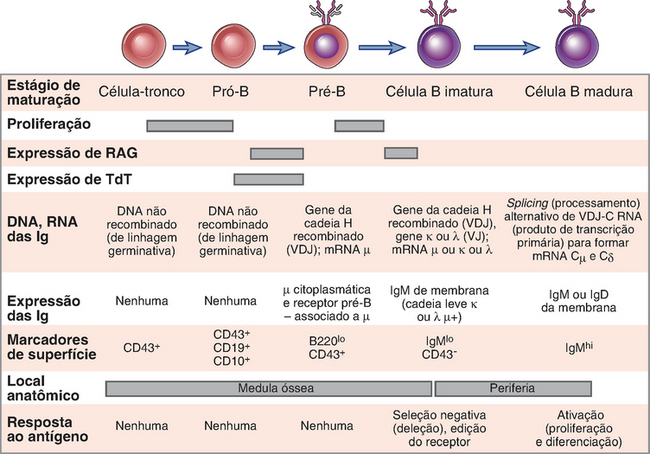 Os principais eventos que ocorrem durante a maturação dos linfócitos B consistem no rearranjo e na expressão dos genes das Ig em uma ordem precisa, na seleção e na proliferação das células B em desenvolvimento, no ponto de controle dos pré-receptores de antígenos e na seleção do repertório de células B maduras. Antes do nascimento, os linfócitos B desenvolvem-se de precursores comprometidos no fígado do feto, e, depois do nascimento, as células B são geradas na medula óssea. Os linfócitos B surgem, em sua maioria, de progenitores na medula óssea do adulto que, inicialmente, são negativos para as Ig, desenvolvem-se em células B imaturas que expressam moléculas de IgM ligadas à membrana e, em seguida, deixam a medula óssea para amadurecer principalmente no baço. No baço, as células que se desenvolvem em células B foliculares que expressam IgM e IgD em sua superfície e adquirem a capacidade de recircular e ocupar todos os órgãos linfoides periféricos. Essas células B foliculares dirigem-se para os folículos linfoides, onde são capazes de reconhecer antígenos estranhos e responder a eles. Estima-se que o desenvolvimento de uma célula B madura de um progenitor linfoide leve 2 a 3 dias nos seres humanos.