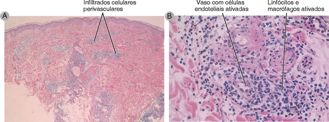 FIGURA 18-7 Morfologia de uma reação de DTH. A, O exame histopatológico da reação cutânea ilustrada na Figura 18-6 exibe infiltrados perivasculares de células mononucleares na derme. B, Em maior aumento, o infiltrado consiste em linfócitos ativados e macrófagos que circundam os vasos sanguíneos pequenos nos quais as células endoteliais também estão ativadas.